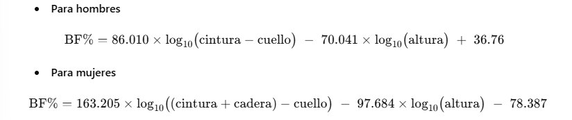 - Se basa en la metodología usada por el Ejército y la Marina de los Estados Unidos (US Army / US Navy Method). Estas fórmulas aprovechan la relación entre ciertas medidas corporales y la altura para estimar el porcentaje de grasa: